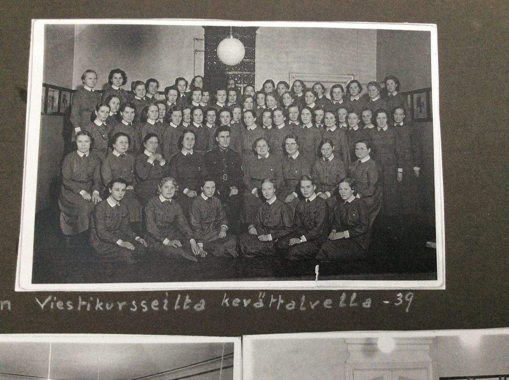 Tummahiuksinen Hilkka Rantio (takarivin toinen vasemmalta) lottaseurueessa.