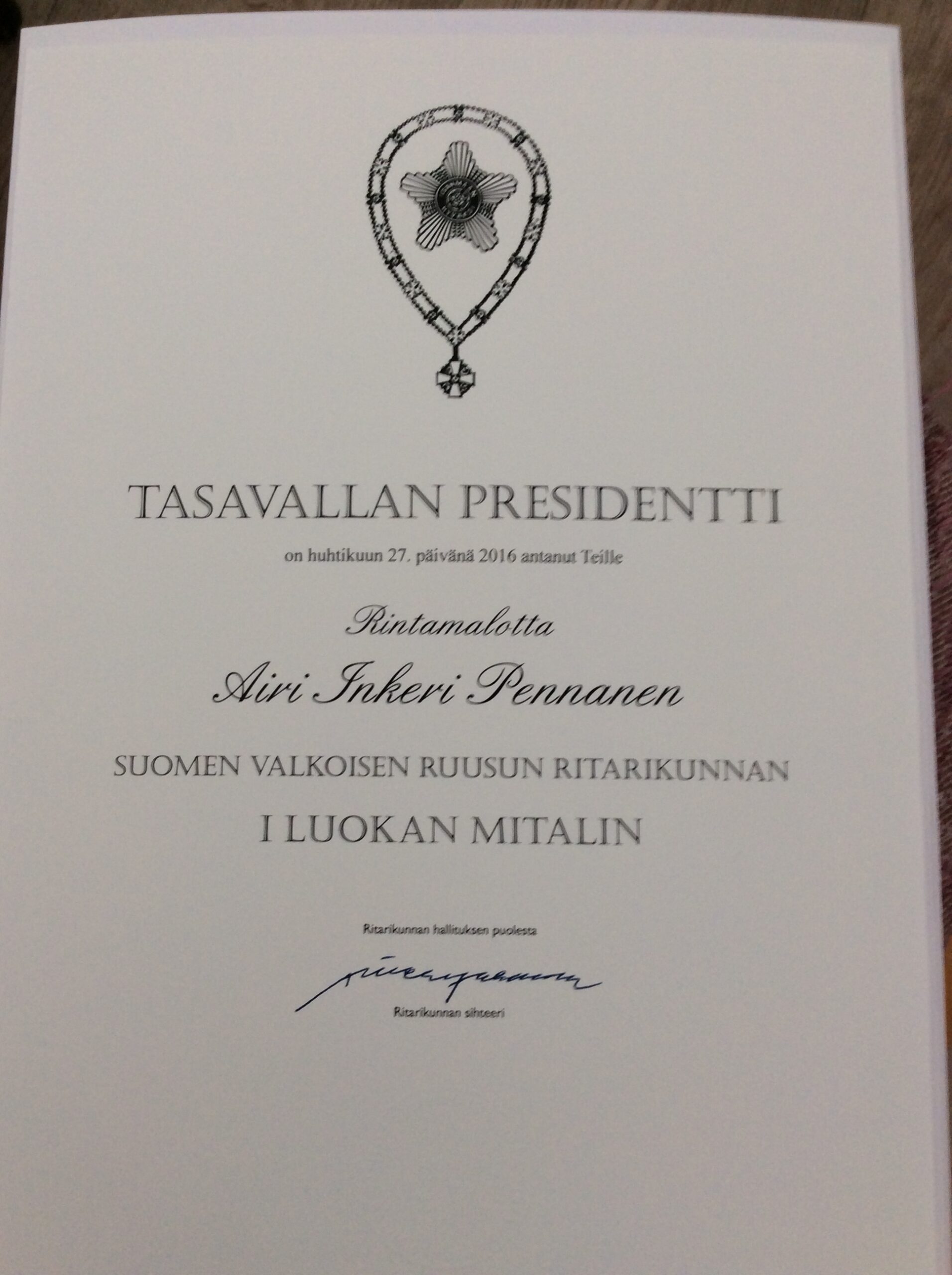 Hilkka Rantion kunniamerkkejä on ihastellut myös presidentti Tarja Halonen Rantioiden vieraillessa Linnanjuhlissa.