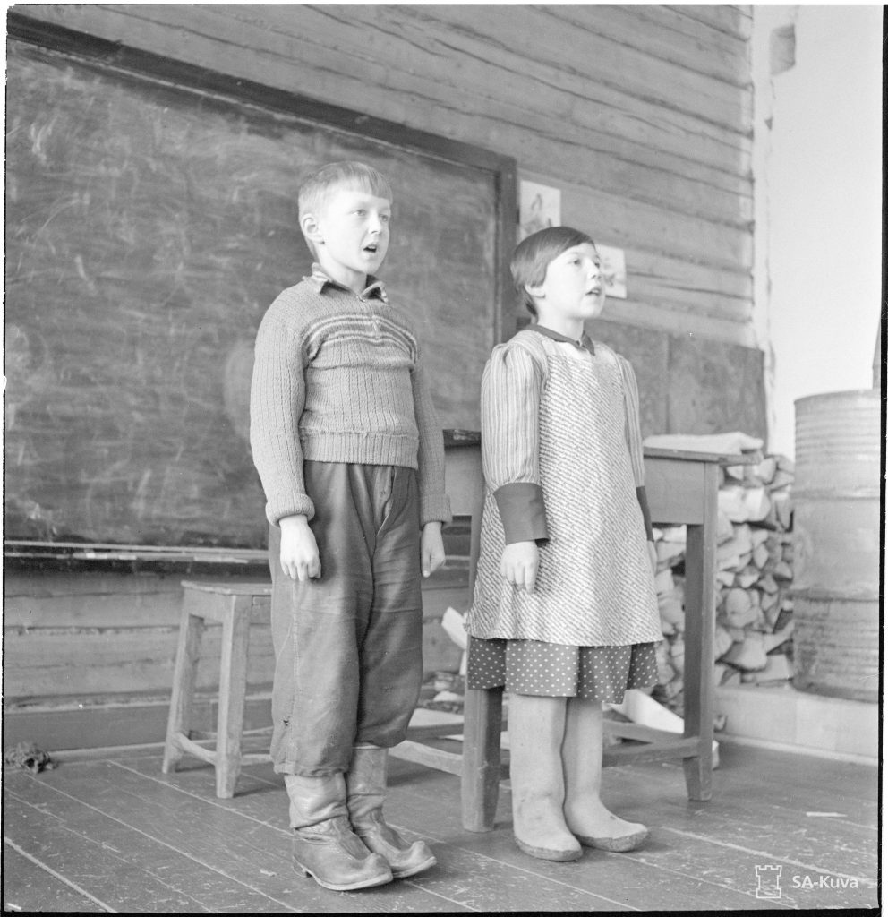Sotaorvot olivat lähellä Gerdan sydäntä. Kuvassa orvot 8-vuotiaat kaksoset lausuvat yhdessä Kalevalaa, Aunus 1942. SA-kuva.