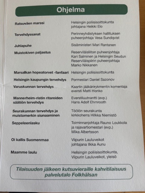 Juhlapuheen Ratsaspuistossa piti sisäministeri Mari Rantanen. Mannerheim-ristin ritarien säätiön tervehdyksen juhlaan toi everstiluutnantti evp. Hans Adolf Ehrnrooth. Helsingin kaupungin tervehdyksen tilaisuudessa esitti pormestari Daniel Sazonov. Helsingin poliisisoittokunta ja Viipurin lauluveikot vastasivat juhlan musiikista.