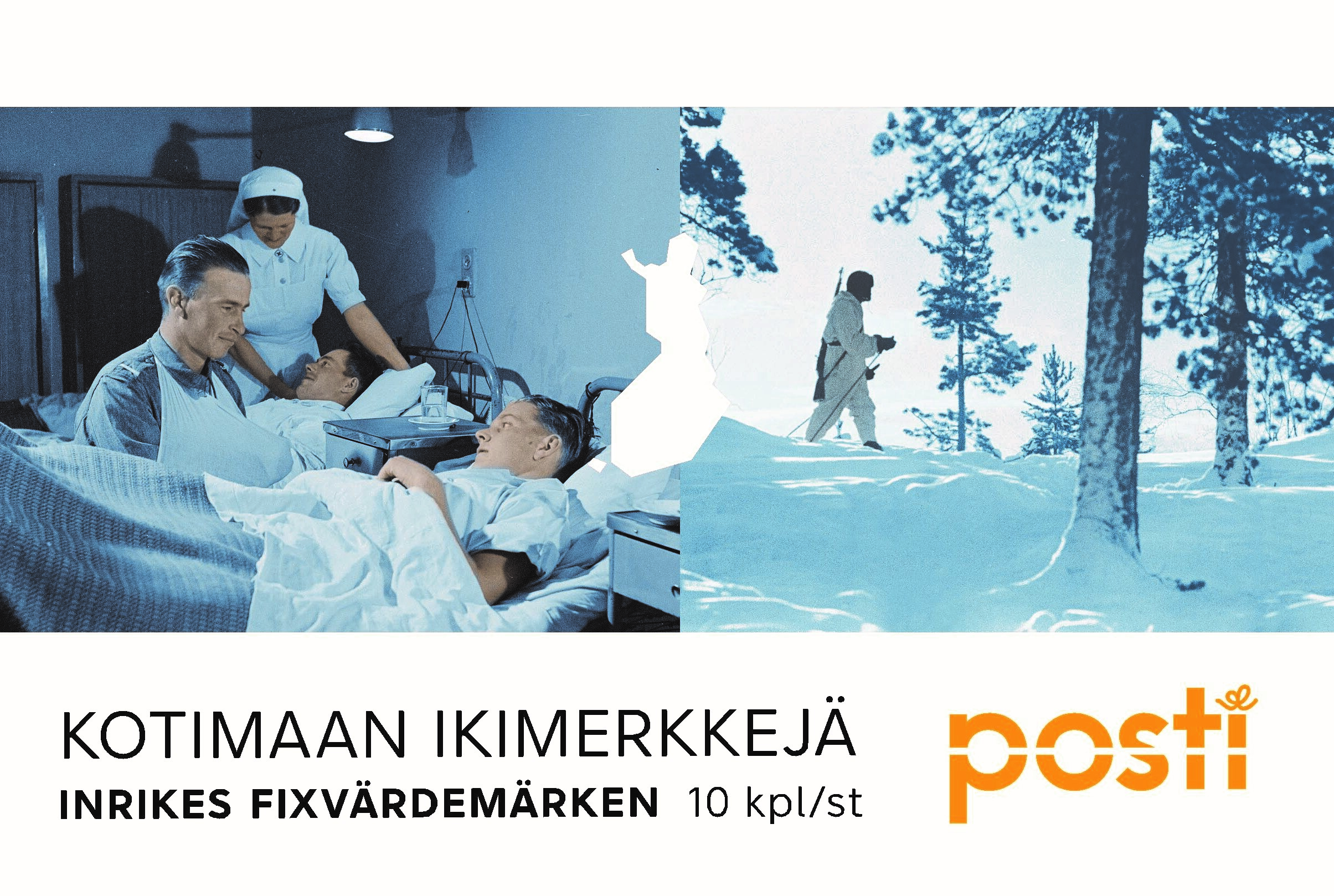 I år har det gått 80 år sedan krigen i Finland upphörde. Samtidigt fyller den yngsta åldersklassen som beordrades ut i krig för Finland 100 år. Idag är det Traditionsförbundet Eklövet som värnar om våra krigsveteraners traditioner och på initiativ av förbundet ger Posti nu ut två frimärken designade av Klaus Welp. Fotografierna på de blåtonade märkena visar en soldat på skidpatrull och en soldat som vårdas på sjukhus. Veteranerna är ett ark på tio frimärken med två olika inrikes fixvärdemärken.