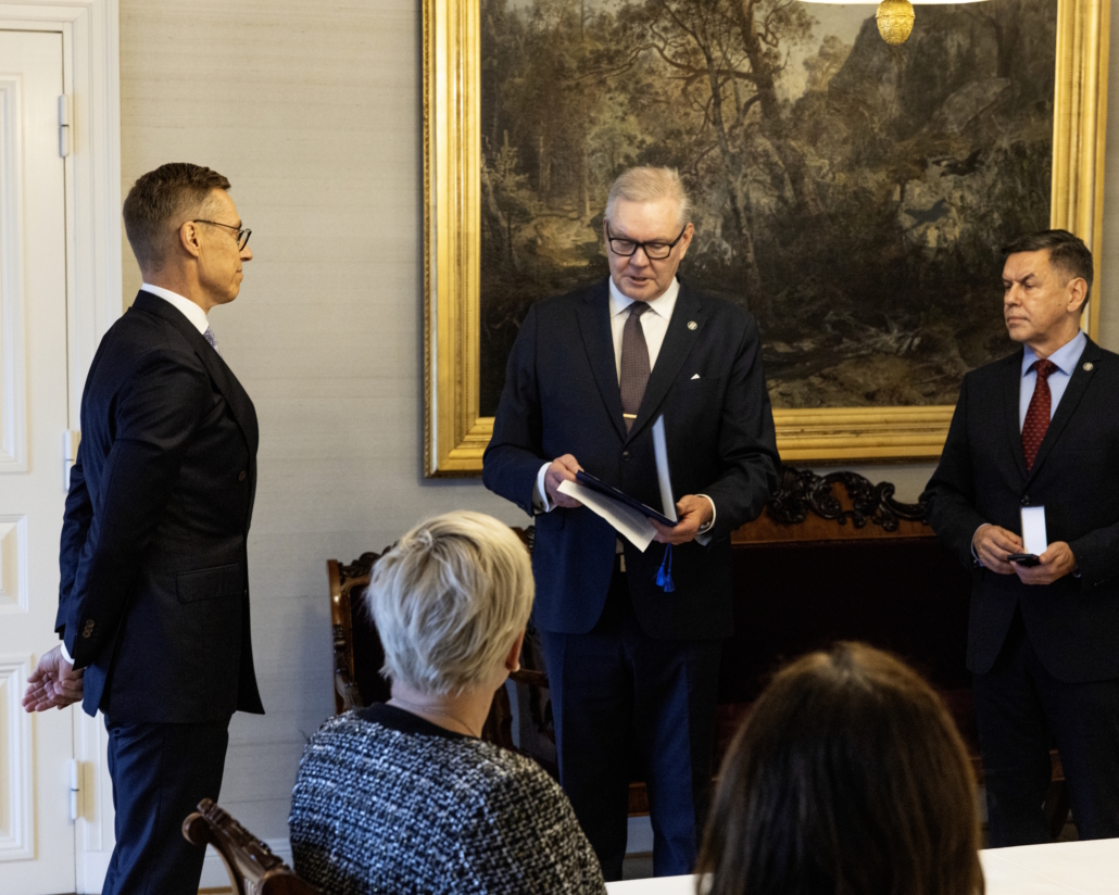 Vasemmalta presidentti Alexander Stubb, puheenjohtaja Timo Laitinen ja toiminnanjohtaja Sakari Martimo.