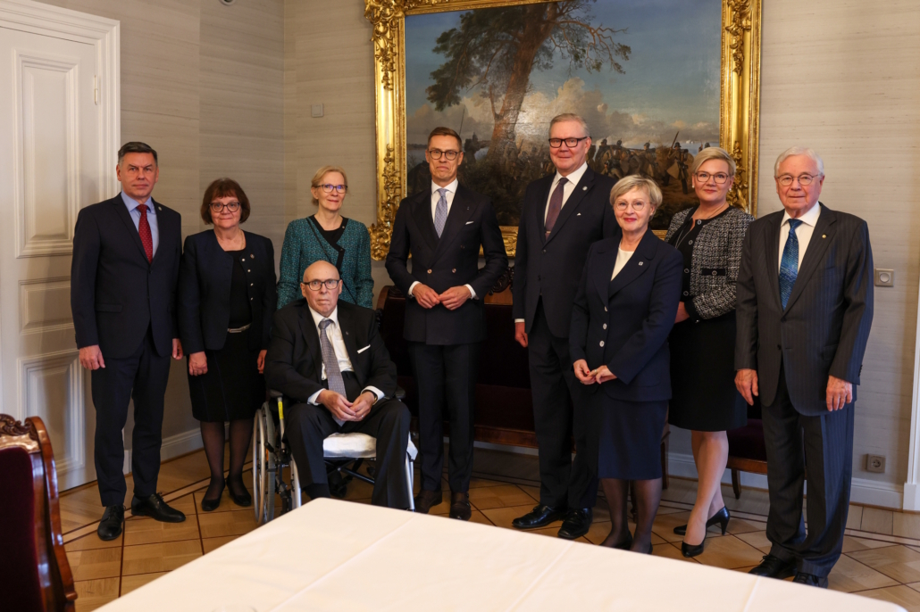 Tasavallan presidentti ja veteraanijärjestöt yhteiskuvassa, vasemmalta Sakari Martimo, Marja-Liisa Taipale, Erkki Heikkinen, Varpuliisa Korpivaara, Alexander Stubb, Timo Laitinen, Riitta Pyhälä, Anne Nurminen ja Matti Louekoski. Kuvat: Emmi Syrjäniemi, Tasavallan presidentin kanslia.
