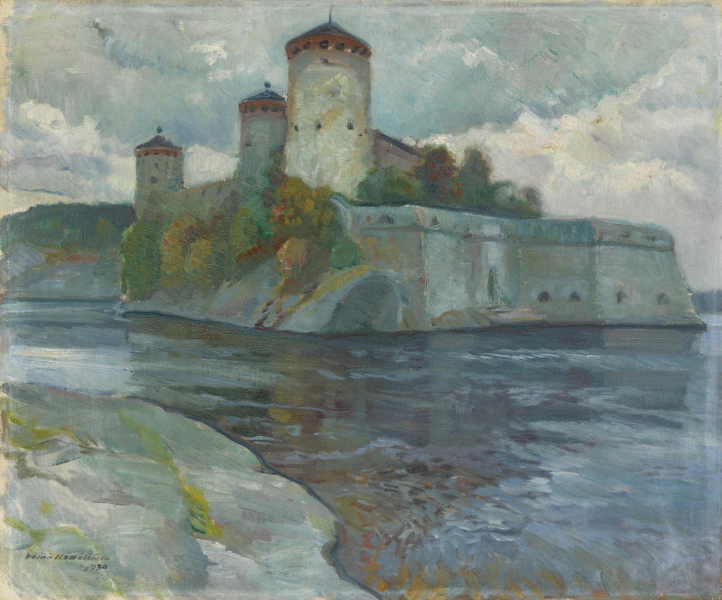 Minulla on sekä Ritarikuntien että Tammenlehvän Perinneliiton puolesta suuri ilo lausua kunnioittava tervehdykseni tässä Olavinlinnan 550-vuotisjuhlassa. Tämä on minulle myös henkilökohtaisesti tärkeää, onhan äitini juuret vahvasti tällä seudulla Kososten ja Makkosten sukujen kautta, Kosolan kylästä Kerimäeltä ja Materkankaalta lentokentän kupeesta.Väinö Hämäläisen öljyväriteos Olavinlinna vuodelta 1930. Kuva: Kansallisgalleria, Jenni Nurminen
