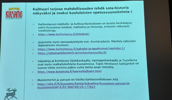 Maikkulassa kuultiin myös Kuusamon kulttuuritoimenjohtaja Ulla Ingalsuo-Laaksosen alustus siitä, miten sota-ajan perinnettä ja historiaa on hyödynnetty Kuusamon alueen matkailussa. Taivalkoskelainen historioitsija Tuomo Horsma kertoi talvisodan perinteen vaalimisesta paikkakunnalla, Jukka Raitio Limingan Lottapatsas-hankkeesta ja toimittaja Juha Hagelberg kotirintaman merkityksestä Pudasjärvellä.