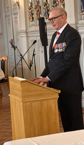 Eversti evp. Pertti Suominen korosti lippupuheessaan Tammenlehvän Perinneliiton tärkeää roolia veteraaniliittojen seuraajana ja vastuunkantajana.
