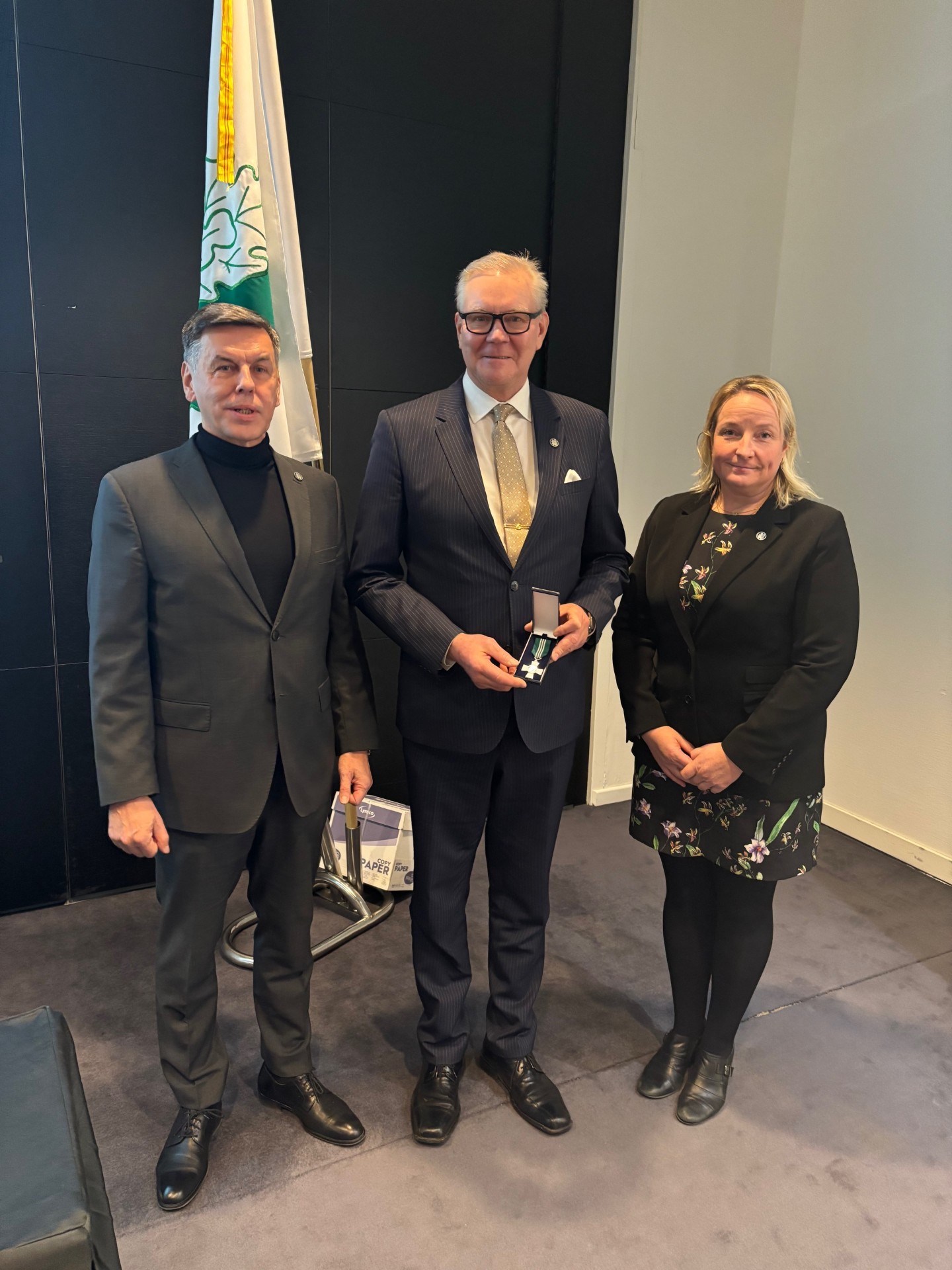Timo Laitinen vastaanotti liiton ansioristin. Toiminnanjohtaja Sakari Martimo, puheenjohtaja Timo Laitinen ja varapuheenjohtaja Minna Nenonen.