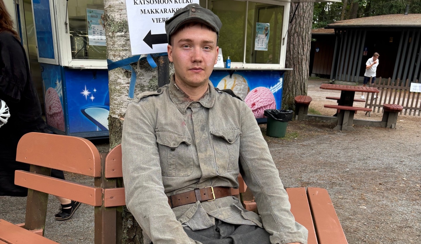 Näyttelijöille urakka on kuumana kesäpäivänä fyysisestikin raskas. Kuvassa ansaitulla tauolla Hauhian roolin hienosti vetävä Severi Muje.