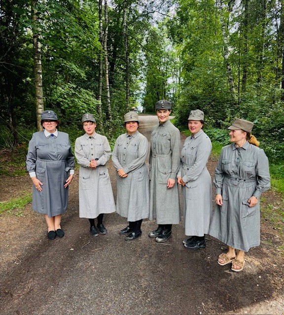 Tuntemattoman sotilaan lottia tauolla lipaskerääjien kanssa. Vasemmalla lipaskerääjä Mari Riikonen, hänen vieressään näyttelijät Liisi Hämäläinen, Noora Koski-Kivinen, Maarit Pakarinen ja Tia-Netta Niemi. Oikealla Veteraanivastuun varainhankinnan päällikkö Pia Mikkonen.