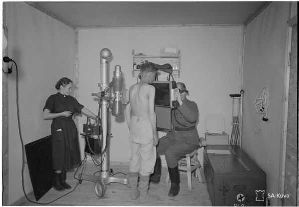Tuberkuloositilanne huononi sodan aikana nuorten ja keski-ikäisten miesten kohdalla. Syynä saattoi olla vaikeat olot rintamalla. Lääkäri tutkii potilaan keuhkoja. Kiestinki, Kananainen 28.5.1942. SA-kuva.