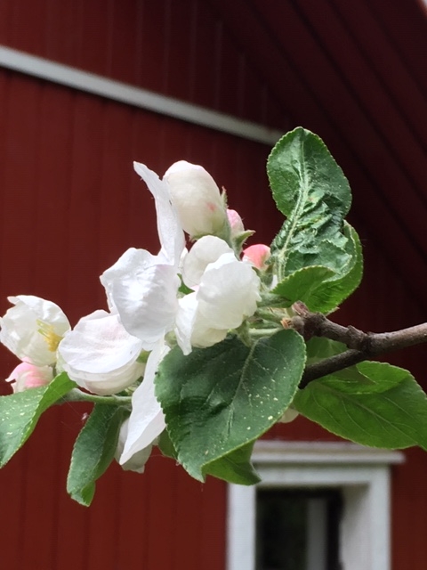 Huhtamossa Kaarinan pihalla omenapuu kukkii.